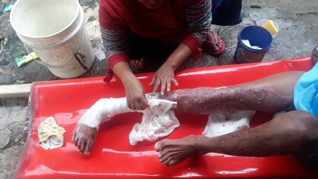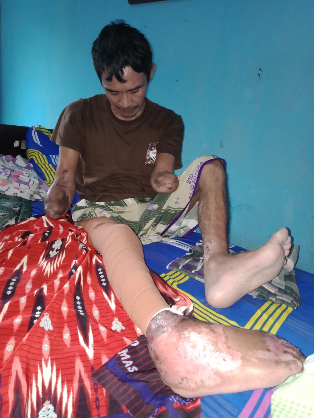 Kini kondisi pak dede sangat memprihatinkan,pak dede tidak memiliki kedua tangan,kaki bengkok karena di patenkan agar luka bakar nya tidak terus menerus mengeluarkan nanah dan darah.