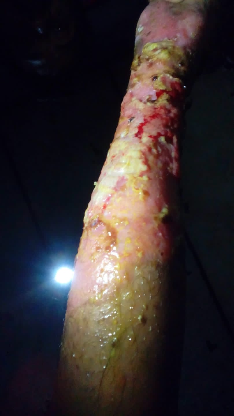 Pak Dede mengalami luka bakar di bagian tangan dan kaki akibat sengatan listrik tegangan tinggi saat pak dede bekerja.