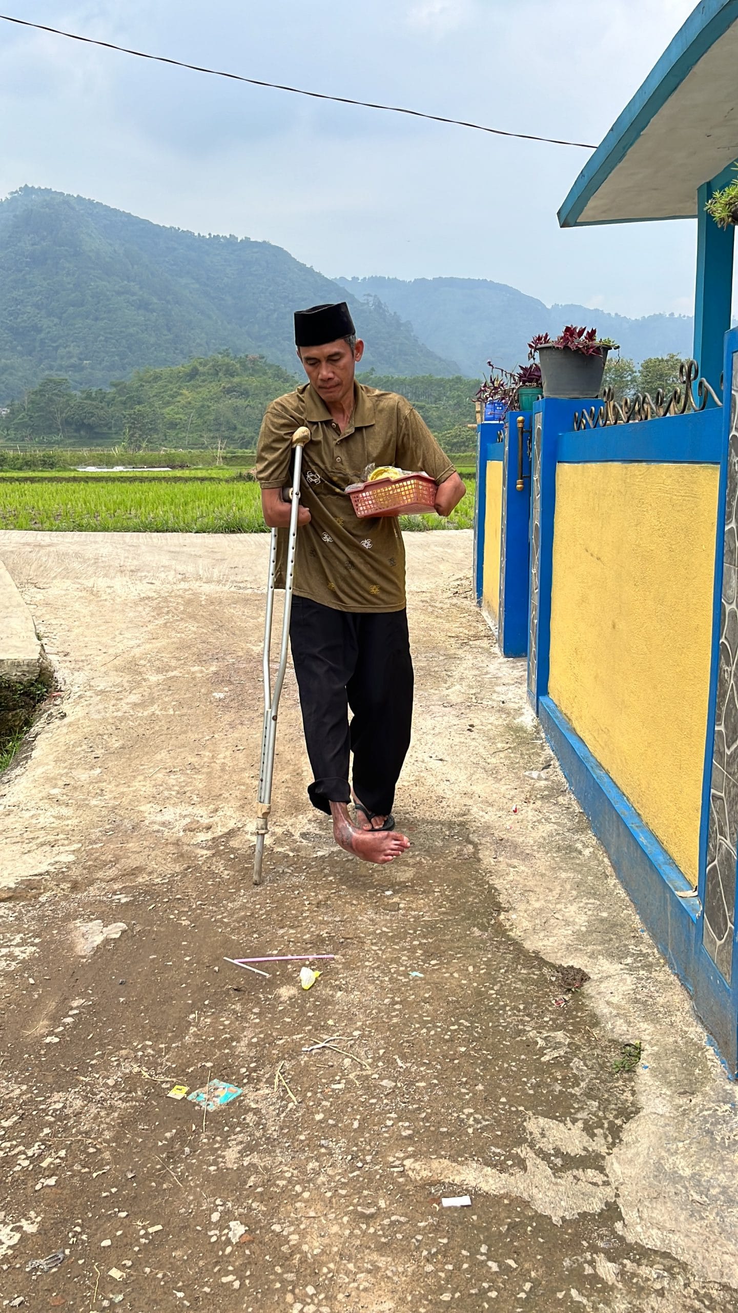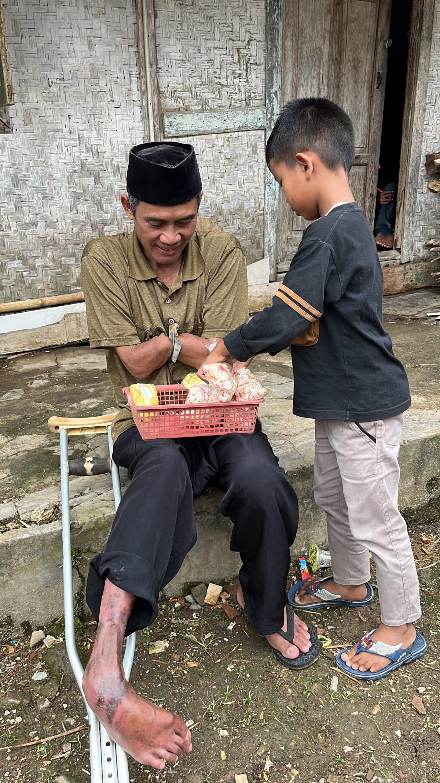 Dulu sebelum kecelakaan ini terjadi,pak dede seorang buruh bangunan,namun saat ini pak dede hanya bisa berjualan makanan ringan yang ia jajakan keliling kampung dengan menggunakan sebelah kaki nya. Tak seberapa memang penghasilan yang diterima pak dede,hanya 10-20 ribu bersih nya yang bisa dibawa ke rumah.